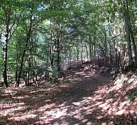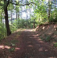 Teď jdeme ještě kousek po žluté. Když žlutá odbočuje vpravo, my jdeme po široké pohodlné neznačené cestě z prudkého kopečka. Občas kouknu na mapu, zda jdeme správně. Na neznačeném rozcestí čtyř cest se stáčíme prudce vpravo, cesta začíná mírně, ale skutečně jen mírně stoupat. Skály zcela zmizely, ale les v CHKO Křivoklátsko je hezký. Brzy jsme na žluté značce, po které jsme odcházeli od auta.