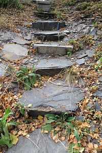 Poslední půl kilometru dlouhé stoupání nám dává zabrat - oběma. Náhle se mění i ráz krajiny. Předtím jsme šli lesem, okolo byly samé rokle. Teď jdeme okolo opuštěných břidlicových lomů. Břidlice se tady nechá lámat všude a také se skoro ke všemu využívá. Chaty mají podezdívku z břidlice, kolna i celou stěnu. Z břidlice je venkovní schodiště i schody na trase, terasy na zahradě. Přecházíme přes hromady nalámané břidlice. To vše vidíme v obci Zálužné.