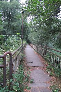 Konečně jsme dorazili na rozcestí Jánské Koupele - můstek. Sem přichází ze dvou stran zelená a červená trasa a společně vedou na lávku k řece a do obce. Tam jdeme i my. Přecházíme po lávce přes náhon k bývalému mlýnu a po druhé lávce přes řeku Moravici. Je zde jez. Tady by se i hezky koupalo. Jenže dnes se sem vracet asi nebudeme. Je půl 8, za chvíli jsme u auta. Naštěstí je ještě světlo.