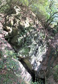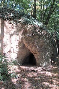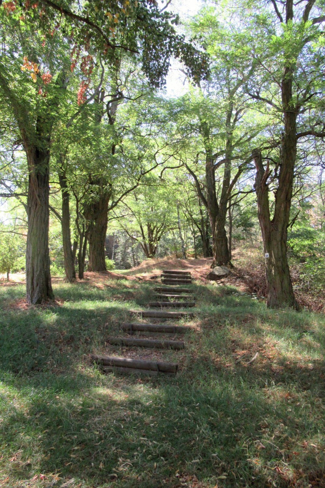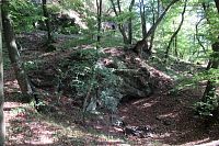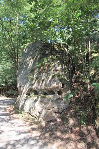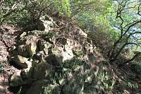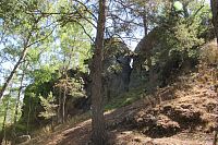 Podle ukazatelel nás čeká 100 m stoupání. Nejdřív jdeme po pár nepohodlných vysokých schodech, pak následuje kousek do prudkého kopce. Okolo nás je skalní lesopark - tak jsem to pojmenovala já. Mohutné skály se schovávají za stromy, vytváří zde zajímavý prostor, kde si místní mladí udělali ohniště.