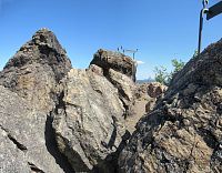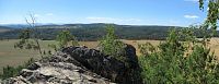 Konečně jsem se dostala na vrchol, ale není tu žádná dřevěná plošinka. Jsou tu jen samé ostré skály. I tady jsou kovové směrovky stejné jako včera. Ukazují nám, kde je Krušná hora s rozhlednou Máminka, oppidum Stradonice, vysílač Cukrák, Vraní hora. Naštěstí se o ty kovové ukazatele mohu opřít, chytit se jich. Hned se cítím bezpečněji. Výhledy jsou krásné a daleké. Tady je i Ota ve svém živlu. Výhledy miluje. Nakonec se i já s jeho pomocí přesouvám mezi vrcholky a rozhlížím se. Těch kovových ukazatelů je tu dost.