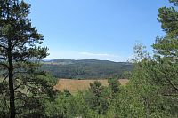 Po snídani pokračujeme v návštěvě skalních vyhlídek. Jedeme do Hudlic. V obci odbočujeme vpravo do ulice Pod Skálou - parkujeme v oblouku ulice na malém prostoru k parkování, ale také blízko rozcestí Hudlická skála - odbočka. Tady je to zajímavé, odtud vedou 3 modré trasy. Jak jsme později pochopili, tak ta jedna je odbočka k Hudlické skále. Je to buližníková skála, na jejímž vrcholu je vyhlídka. Uvnitř skály je prý puklinová jeskyně, jejíž chodba je dlouhá cca 12 metrů. My jsme nikde nic takového nezahlédli. Dokonce ani na mapě ne.