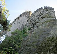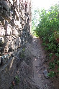 Jdeme po žluté značce, začátek po silnici je mírný, v lese už je cesta prudší, ale ten závěr je hrozný. Kdyby to byly skály, bylo by to perfektní, ale je tu udusaná zemina, jen občas vykukuje kámen. Klouže to. Ota je nadšený, že si vzal hůlky. Ještě před chvílí však tvrdil, že je nese zbytečně. V jednom úseku je natažený řetěz pro snadnější výstup, ale i tak je to náročné. Když jsme se konečně dostali k hradu, vítají nás zamčená vrata s nefunkčním padacím mostem a cedulí, že objekt je obýván, že nemáme přelézat hradby. Předejdeme prý tak nepříjemnostem. S tím jsme nepočítali. Mysleli jsme, že uvidíme ruiny, které si budeme moci prolézt.