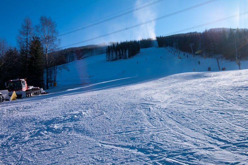 Rychlý nástup zimy na konci listopadu umožnil přípravu lyžařských středisek na novou sezonu, kromě mrazu se dostavilo i sněžení, ačkoliv zrovna v naší oblasti rozhodně sněžení nemělo žádný kalamitní účinek, jako v jiných částech Česka, ale přece jen něco málo napadlo, takže v hřebenových partiích hor leží touto dobou něco mezi 20-30 cm sněhu. V novém středisku v Koutech začali sněžit hned s prvními většími mrazy, takže se 4. prosince mohlo středisko rozjet. Protože kolega z práce chtěl abych tam hned jak to bude možné něco nafotil, tak díky předpovědi počasí jsem se vyrazil podívat na ten zázrak. Nechtělo se mi vstávat moc brzo, tak jsem do Koutů dorazil po desáté hodině. V prodejně Helia sport u areálu jsem si vyzvedl potvrzení o registraci do Active klubu, která by měla zabezpečit nákup levnějších permanentek. V prodejně jsou nějaké lavičky, tak jsem si tady přezul i boty a můžu si tu i nechat batoh. Z terasy nad pokladnami vyhrávala reprodukovaná hudba a jakýsi hlasatel vítá návštěvníky. První Ostrý start asi přinesl nějaké problémy s počítači, přece jen prodej permanentek trošku vázl, ale jek mi to slečna pokladní vysvětlila, je to dáno že musí vydávat ty klubové karty. Tu jsem tedy taky dostal, a na ní je přímo elektronicky nahrán typ jízdenky. Aby to čekání ve frontě nebylo tak dlouhé, rozdávali dnes pořadatelé na zahájení skleničku šampaňského zdarma a zdarma má být dnes i večerní lyžování. To bude na osvětlené sjezdovce u Snowparku. Tak přes lávku nad Divokou Desnou k vleku, který je tím osvětleným, od něho se dá sjet už k té vychvalované šestisedačce. Po pomalém rozjezdu se lanovka skutečně napojí na lano a nahoru vyjede celkem rychle. Nahoře ve výšce kolem 1080 m je krásně slunečno, dole údolí je daleko více zahaleno ve stínu. To je nakonec dobře, aby se tu sníh dlouho udržel. V provozu je tedy i horní vlek, nazvaný jako U Vrtulí, horní část sjezdovky je poměrně mírná a u dolní stanice vleku je prozatím sjezdovka přehrazena lanem, než se vysněží celá tzv. Medvědí sjezdovka (dle hory nad sjezdovkou). Odbočuje se tedy doleva po sjezdovce zv. Hřebenovka, zpočátku široké cca 20 m , v závěru se jedná spíš jen o cestu, na konci se sjezd musí trošku pustit, protože klesání se mění v rovinu, možná že i mírně do kopečka, ale z dobrou rychlostí to jde přejet. Za rovinkou opět začne klesání a sjezdovka odbočuje Doprava značně prudkým sešupem, který se po nějakých 150m trošku mírní, ale pořád je to dosti slušný svah až dolní stanici lanovky. Je tedy vidět, že provozovatelé dosti spěchali, aby mohli dnes začít, ne všechny hromady nastříkaného sněhu jsou roztahané, některé části sjezdovky (dojezd) jsou ještě ohrazené, a přece jen těch cca 50 cm nastříkaného sněhu je relativně málo, protože přece jen sjezdovky jsou zatím spíše hliněné, dokud nebudou porostlé trávou, rolba vždy nějaké kamínky vyorá. Nakonec vzal jsem si kvůli tomu staré lyže, tak mě to tak nebolí. Každopádně, nebude-li předpověď počasí chybná, mělo by dál mrznout a zase i snad sněžit, takže možná do Vánoc bude areál v daleko lepším stavu. Navíc přijelo na poprvé skutečně hodně lidí, a to lyžaři všech možných kategorií, někteří by měli spíš zvážit nějakou cvičnou loučku třeba v Loučné, nebo nakonec na sedle, ale velké středisko láká. Až bude zasněžená i Medvědí sjezdovka , tak se ten dav snad taky trochu rozprostře. Zdá se, že kapacitně by velká lanovka stíhat měla, u dolní stanice lanovky určitě nebylo čekání delší než 3-4 minuty. Zajezdil jsem si tak 3 hodiny, a pak ještě navštívil budovu s restaurací a jídelnou, gulášovka za 40,- Šerák za 25,- Kč, napoprvé to celkem šlo, hlavně díky krásnému počasí.