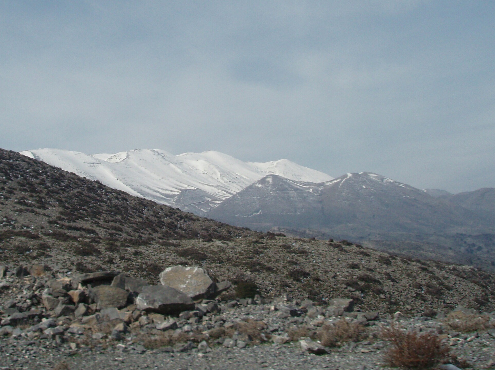 Chvílemi jdeme ve sněhu, v některých místech leží bílá pokrývka i ve větší ploše. Zde již netrpělivě vyhlížíme hlavní turistickou cestu E4, na kterou bychom se měli napojit. Avšak následuje, pro někoho možná krátký vděčný úsek dolů, pro nás bohužel ztráta pracně nabrané výšky. Po sestupu ze sedla pokračujeme Doprava stezkou, nestezkou a pořád do kopce. Sněhu přibývá a něco mi říká, že sandály, které mám na nohou, nejsou tou pravou obuví pro zbytek dnešního dne. Dělám přestávku a přezouvám na zimní výbavu. Franta zvolil celoroční univerzální obutí, zvané též tenisky. Nakolik to byla dobrá volba, se dalo posléze odvodit z jeho nadávek ve vrcholové partii cesty, která obsahovala sněhová pole. Šlapeme a šlapeme, ale pořád ten náš kopeček nevidíme. Za každou zatáčkou čekáme ten správný pohled, ale vždy následuje další zatáčka a tak to jde pořád dokola. Jeden úsek je traverz, okolo kopce Angathias, po docela prudkém sněhovém poli, jinak se jedná o celkem jednoduchý výstup. Začíná se ochlazovat a sílí vítr. Těšíme se už na vrchol, kde zalezeme do kamenného stavení. Podle všeho bychom se už měli blížit k našemu vysněnému cíli. Šplháme se snad již na poslední kopec, ale kaple nikde. Jen malá zídka a pár kamenů na hromadě. Nabízí se nám úchvatný pohled na okolní pohoří a jižní i severní pobřeží, jen pohled na západ je pro nás trochu překvapující. Asi kilometr vzdušnou čarou se před námi vypíná skutečný nejvyšší vrchol Kréty. Teprve teď jsme na místě, o kterém jsme si mysleli, že už máme dávno za sebou. Nacházíme se totiž dle průvodce teprve ve druhém sedle, ze kterého je poprvé vidět kamenná kaple na vrcholu. Začíná to tu pořádně fučet. Musíme ale opět sestoupit kousek dolů a poté již následuje poslední výstup. Měli bychom jít údajně po centrálním hřebeni, ale mne tento závěrečný úsek připadá jako celkem solidní stoupání po návětrné straně. Přesto si užíváme úžasný pohled na obě dvě strany, vidíme k jednomu i druhému moři. V osmnáct hodin a patnáct minut stojíme na nejvyšším místě Kréty na kopečku zvaném Psiloritis ve výšce 2.456 metrů nad mořem. Někdo by mohl říct nic moc výška, ale když si uvědomíme, že "nad tím mořem" skutečně jsme (jižní pobřeží je daleko cca20 km, severní asi o pět kilometrů dále), tak je jasné, že to jsou opravdu Hory.