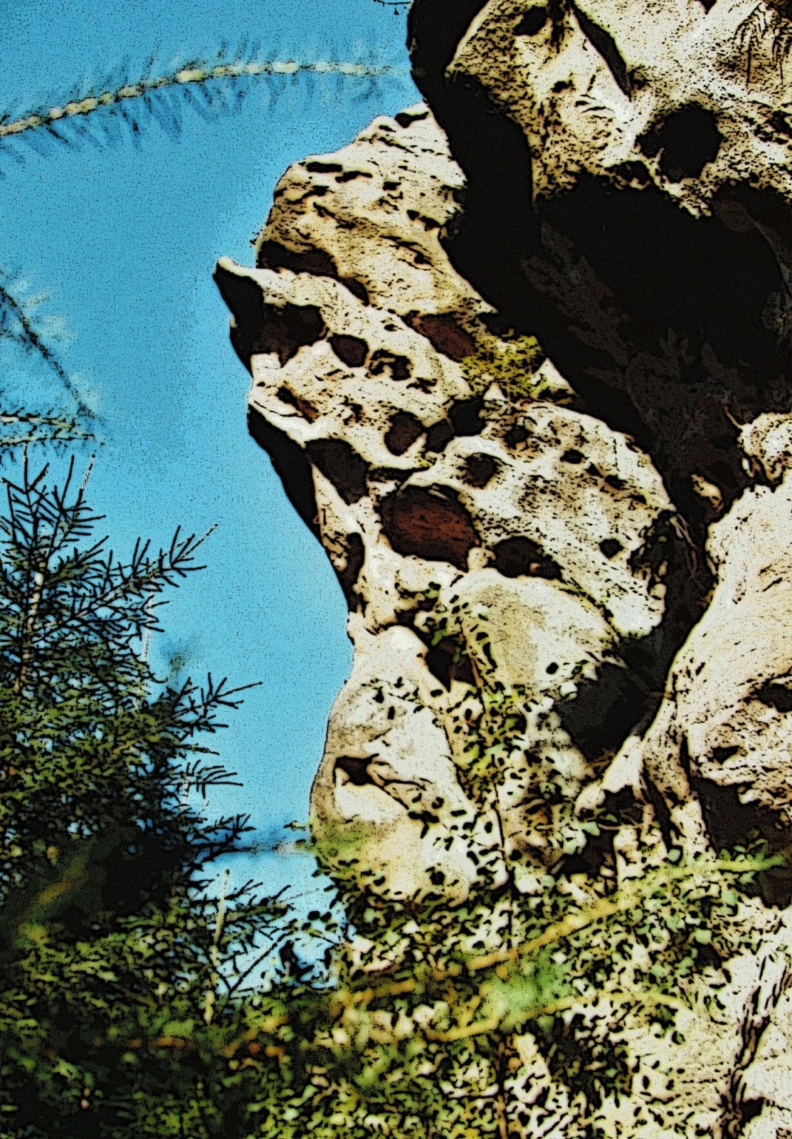 Další cesta vede lesem k Horním skalám a tady jsem nemile překvapen : vše ve stínu a navíc proti světlo a aby to nestačilo, tak je tu všude spousta táborníků i horolezců ! A to jsem si bláhově myslel, že když je dneska pracovní den, tak tu nikde nebude ani noha ... Takže fofrem pryč !!!