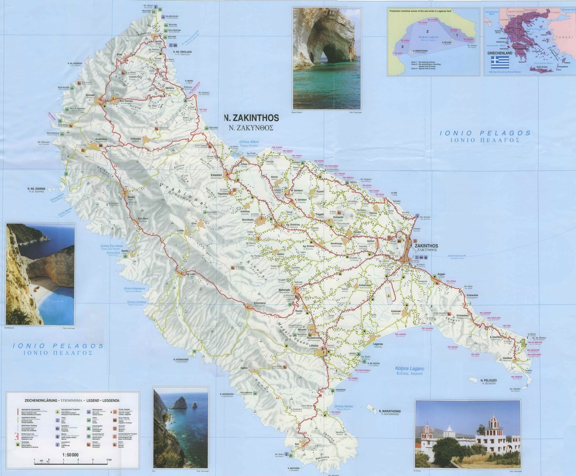 Směrem na východ od Laganasu je dlouhá písčitá pláž, s velmi pozvolným vstupem do vody (ideální pro děti), Kalamaki beach. Na této pláži si jako na jedné z mála můžete nasbírat nějaké mušle, protože jich tu je opravdu dost. Na ostatních plážích ostrova jich už moc nenajdete. Pěkných pláží je na ostrově opravu hodně, pokud jste tedy „motorizovaní“ záleží jen na vás, která bude pro vás ta nejkrásnější. Nejfotografovanější pláží (a to nejen tady, ale patrně v celém Středomoří) je pláž Navagio – další ze symbolů ostrova. Na pláži leží vrak lodi a jen tak dokresluje až neskutečnou krásu pláže obklopené skalisky, které ostře kontrastují s nádherně modrou barvou moře. Už jen pro pohled na tuto pláž se vyplatí Zakynthos navštívit. Pláž je přístupná pouze z moře a není problém si výlet na ni zakoupit. A když už jsme u výletů po vodě, určitě stojí za návštěvu Blue Caves – Modré jeskyně na samém severovýchodě ostrova. Z vlastní zkušenosti doporučuji k výletu využít některou z menších lodí, protože s ní kapitán může do nejedné jeskyně vplout a zážitek tak ještě umocnit. Podobné jeskyně a pobřeží jsou i na jihu – jeskyně Keri. Výchozím bodem pro cestu k nim, ale i pro návštěvu protějšího ostrůvku Marathonisi a vlastně celého Laganaského zálivu může být vesnička Limni Keri. Tam jsme v apartmánu (zakoupeného u CK Viamare) bydleli my. Klidná vesnička se základní infrastrukturou plně splňovala naši představu o základně, odkud jsme vyráželi na jednotlivé výlety, nebo se koupali na jedné z místních pláží. A na konci místní oblázkové pláže jsme si po základní instruktáži půjčili na pár hodin motorový člun a objeli s ním výše jmenovaná místa. Z jeskyní Keri jsme toho moc neviděli, protože nás člen místní pobřežní stráže varoval, že je u nich neklidné moře a cestu dál nám tedy nedoporučil (což nás sice nepotěšilo, ale na druhou stranu smekám před kvalitou jejich práce) – tak jsme ušetřený čas věnovali hledání Karet (bez úspěchu).