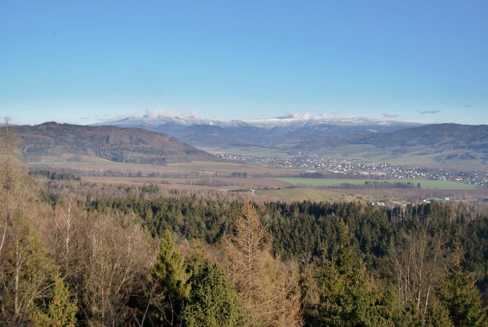 Účelem výstupu na Kokeše však nebylo žádné bilancování nad dny zmizelými … a už vůbec ne zoufalá snaha vytvářet si nějaká nesplnitelná předsevzetí do těch příštích. Prostě jsme jen přes Čarovný les a Tulinku vyšli na oblíbený skalní útvar a tady se – s několika dalšími podobně postiženými – dlouze kochali. Zejména směrem k lehce „pocukrovanému“ horskému masivu za údolím řeky Desné. Asi nás ten nahoře musel mít docela rád, když nás na své šachovnici umístil zrovna na toto „políčko“ (tím ovšem netvrdím, že by např. v Toskánsku nebo Provence bylo nějak zvláště zle) …