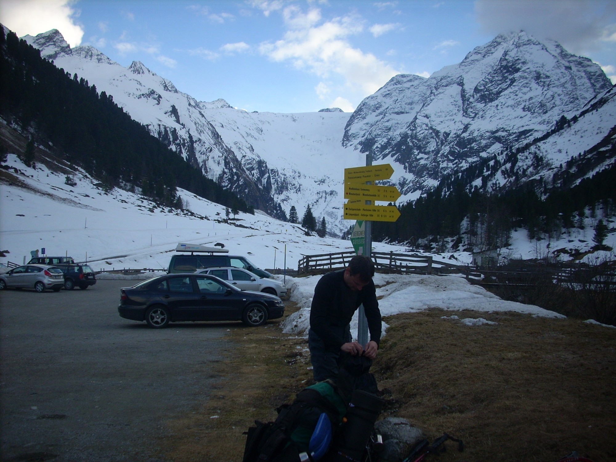 V sobotu ráno odjíždíme z Olomouce a kolem půl sedmé večer nás kamarád vysazuje na parkovišti v osadě Lüsens a odjíždí o údolí dál, kde má domluvené ubytování v penzionu. Je nám jasné, že na chajdu za světla nedojdeme. Navíc to ani nemá cenu, protože jsme se pokoušeli rezervovat si nocleh, ale chatař nám říkal, že má plno. Takže máme batohy těžké jak potvora. Čeká nás proto velmi pomalý postup. Ale zase nemusíme nikam spěchat, protože v něm máme uložené celé naše přechodné bydlení – stan, spacáky, vařič…. a další spoustu nezbytných věcí.