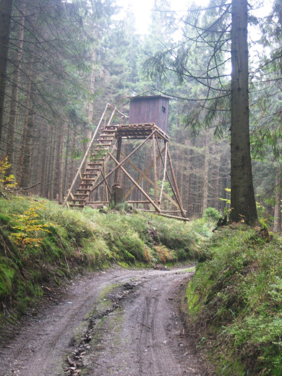 Krátce po 9.hodině vystupuji na sedle Skřítek a vidím, že se mé nejhorší obavy potvrdily - nevypadá to tu jako v Jeseníkách, ale na Šumavě - přes les se válí inverzní mraky a mlha, no - aspoň že neprší ! Po zelené a modré značce jdu nádherným lesem plným nejedlých hub. Předbíhám jednoho dědu, který tomu nevěří a zkoumá je hrotem svého čakanu. Zanedlouho se značky rozdělují - zelená pokračuje ke Krtinci a na Hvězdu - já ještě kousek po modré a pak lesní cestou k vrcholu Bílého kamene. Cesta ale po chvilce přestává stoupat a tak se z ní trhám a volím přibližný směr vrchol přes les. Není to ale nejšťastnější volba : terén je plný dolíků a vývratů, které musím obcházet a tak nechtěně minu údajně vyhlídkový Bílý kámen a vycházím na pěšinu na vrcholovém hřebenu a pod stromem s cedulkou a šipkou Skály. No nic, vracet se nebudu - stejně je mlha - a tak s optimismem dál...