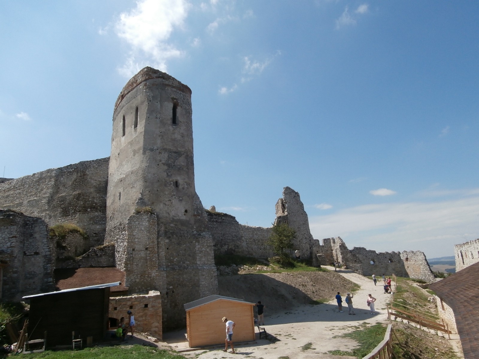 Zaparkovali jsme hned na kraji vesnice a posbírali to nejnutnější, co budeme potřebovat na pár hodin strávených na hradě. Dan při té příležitost zjistil, že meloun, který vezl, trochu prasknul a poněkud zaneřádil úložný prostor v autě. V rámci možností se snažil minimalizovat následky této nehody a meloun se po dobu naší nepřítomnosti přestěhoval do stínu k zadním Kolům. Pak jsme se vydali směrem, kterým vyrazilo pár lidí před námi, a doufali jsme, že oni vědí, kam jdou. Věděli. Po chvilce jsme došli ke žlutě značené trase vedoucí vzhůru k hradu. Trochu nás překvapila nadmořská výška, pouhých 200 m nad mořem a hrad byl plus mínus na stejné úrovni jako naše letovické náměstí. Cesta byla klasická „polňačka“, mírné stoupání, kousek prakticky rovinka a na závěr jako bonus příkrý svah. Cesta hladká, bez nějakých pomocných záchytů, jako jsou kořeny nebo kameny, jít tudy dolů, tak by to asi byla dobrá skluzavka. Když jsme se dostali nahoru, na zeleně značenou trasu vedoucí z Čachtic (což mimochodem je pohodlná široká štěrkem vysypaná cesta, po které se v pohodě prošlo i s kočárkem a po které pak přijela i auta s nějakými svatebčany), byli jsme na dohled od brány. Zkoukli jsme informační tabule před hradem a po chvíli už jsme stáli u kasy. Čachtická zřícenina byla zrovinka v červnu po rekonstrukci znovu otevřená, před rekonstrukcí byl vstup zdarma, teď to vycházelo na 2,5 eura na osobu. My jsme měli tak trochu kliku, slečna měla zrovna vyjetou navíc vstupenku na 18 eur, potřebovala ji asi nějak udat a my jsme byli první, kdo se nachomýtl, takže každý z nás ušetřil horentní sumu 25 centů