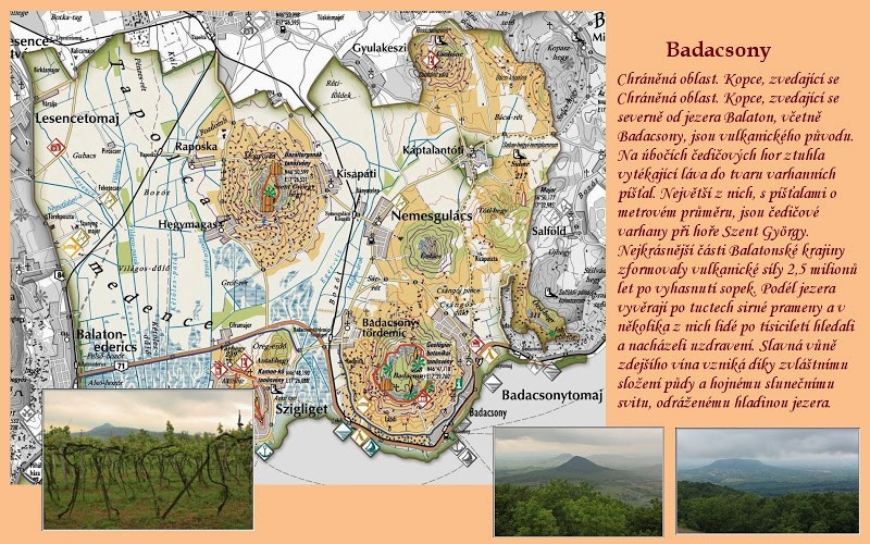 Starší generace si bude Badacsony pamatovat jako značku ne právě dobrého maďarského vína. To je ale už dávno minulost! Pojeďte za vínem a výlet spojte s vycházkou na stolovou horu - sopku tyčící se nad Balatonem! Výlet je dobré začít v městečku Badacsony u nepřehlédnutelného kostela. Žlutý pruh vede kolem vojenského hřbitůvku stále nahoru. Dovede vás až na červený pruh, který obchází celý vrchol. Z tohoto okruhu lze několika dobře značenými cestami odbočit na samotný vrchol, kde je volně přístupná rozhledna Kisfaludy Sándor 438 metrů nad mořem. Protože Balaton má necelou stovku, vyšlapali jsme nahoru skoro 350 výškových metrů. Kromě vlastního rozhledu rozhodně stojí za to odbočit k některým okrajovým skalám, které nabízejí další výhledy na okolní sopky. Cestu z vrcholových partií zpět doporučuji po modrém kolečku. Četné schody nás zavedou zpět na červený okruh a po něm se vrátíme do Badacsony. Cesta vede kolem vinic, a když uvidíte žlutý pruh směřující k jihu (jiný než ten, po kterém jsme stoupali nahoru), dejte se po něm. Vede skrz nejznámější vinařskou uličku s mnoha sklípky. Nelze odolat – zasloužíte si pár deci. Kromě vína (Muškát, Ryzlink, Šedý mnich) je výtečná i cena, kterou za něj zaplatíte. Místní říkají, že je to víno dvou sluncí – jedno je to na obloze a druhé odrážející se od hladiny Balatonu.