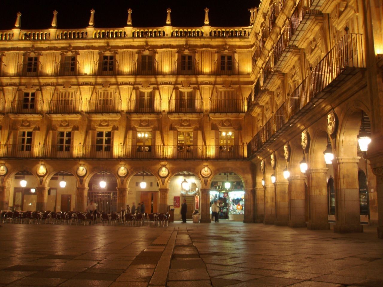 Podle rady z průvodce si nacházíme ubytování v hostelu Pensión Los Ángeles. Nachází se v prvotřídní lokalitě, přímo na náměstí, ale ceny jsou zde senzačně nízké. Před půlnocí se vydáváme na průzkum nočního města. O Salamance se píše, že nežije pouze minulostí, nýbrž se má jednat o živé univerzitní město. Zdejší početná, asi padesátitisícová studentská populace bere často noc útokem. Před námi je tudíž město probouzející se k čilému nočnímu životu. Kromě úžasně nasvícených památek navštěvuje bary a pozorujeme místní lidi. Ten pravý studentský podnik objevujeme až úplně nakonec, když už se chystáme k návratu. Jedná se o rušný irský pub O´Hara´s. Hraje tady kapela - kytara, bicí a saxofon. Ve dvě hodiny po půlnoci to vypadá, že noc je ještě mladá, jakoby studentský večírek teprve začínal. Moc se nám tady sice líbí, ale z finančních a časových důvodů po půlhodince tento báječný podnik opouštíme. Když přicházíme zpět na pokoj, ručičky hodin ukazují 2 hodiny a 30 minut a tudíž je čas myslet zase na spánek.