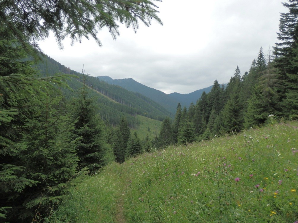 Na konci polany, před ponořením do lesa, se schováme pod stříšku seníku, abychom přečkali déšť. Další úsek lesem do Stanišovského sedla je pěkný krpál, naštěstí jen půl kilometru dlouhý. V sedle se křižuje naše žlutá značka s červeným značením. Při krátkém odpočinku spatříme v severovýchodním směru několik malých chatek rozesetých v Brtkovické dolině.