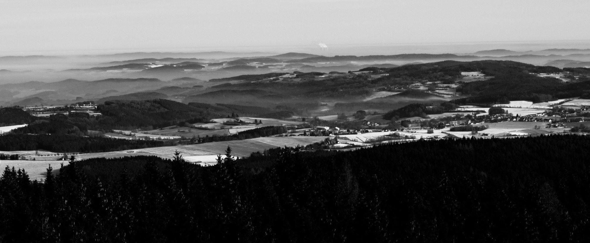 Hned po snídani přijíždí autem správce rozhledny a tak se v očekávání velkolepých výhledů shora vydáváme na malou ranní rozcvičku. Horní, přistavěná část je kovová a tak rachot, který vydává je dost nepříjemný. Myslím, že již zvěř dávno opustila zdejší polesí. Kolem jsou hluboké lesy, přehlédnout jde nejen Šumavu, ale i značnou část jižních Čech s mohutnými věžemi temelínské jaderné elektrárny.