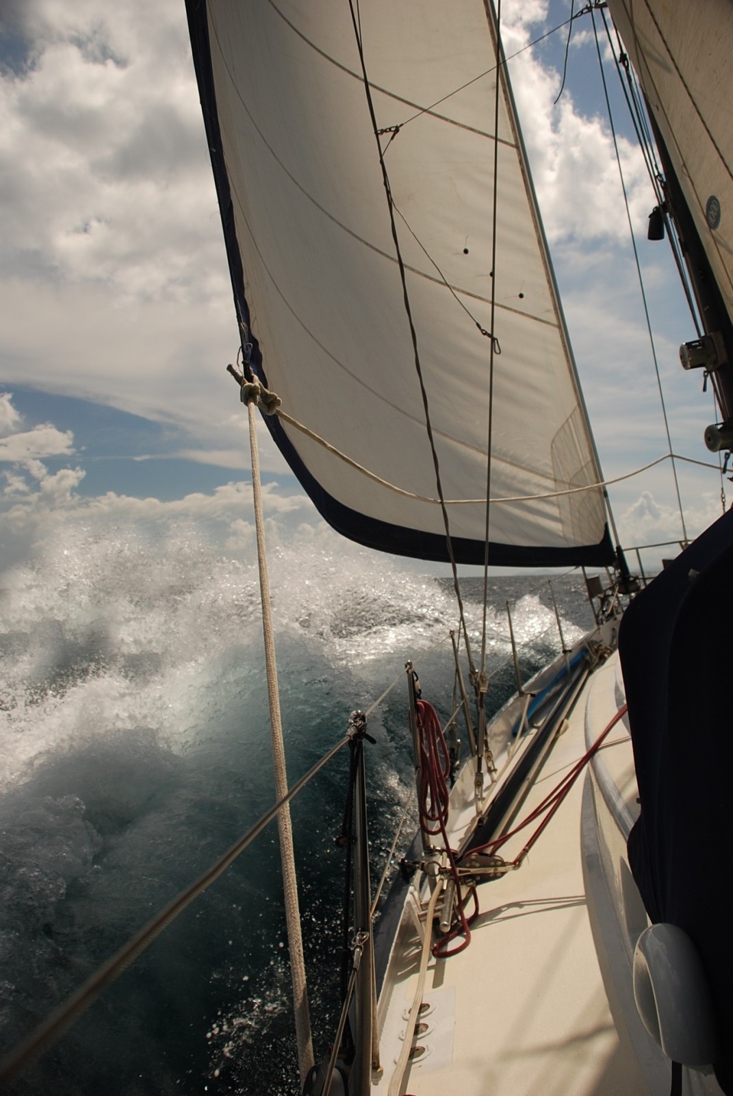 Ráno se na palubě, kde jsem spal, objevil jako první nejmladší člen posádky. Ale hned za ním John, aby dcerku zapnul do „obojku“, který jí obepínal pas a jímž byla připnuta k nataženému ocelovému lanku, aby během plavby nespadla do moře. „Zkoušeli jsme jí hodit do vody, abychom věděli, jestli se udrží na hladině. Pod vodu sice hned nešla, ale raději ji máme pořád připnutou,“ sděluje mi John.
