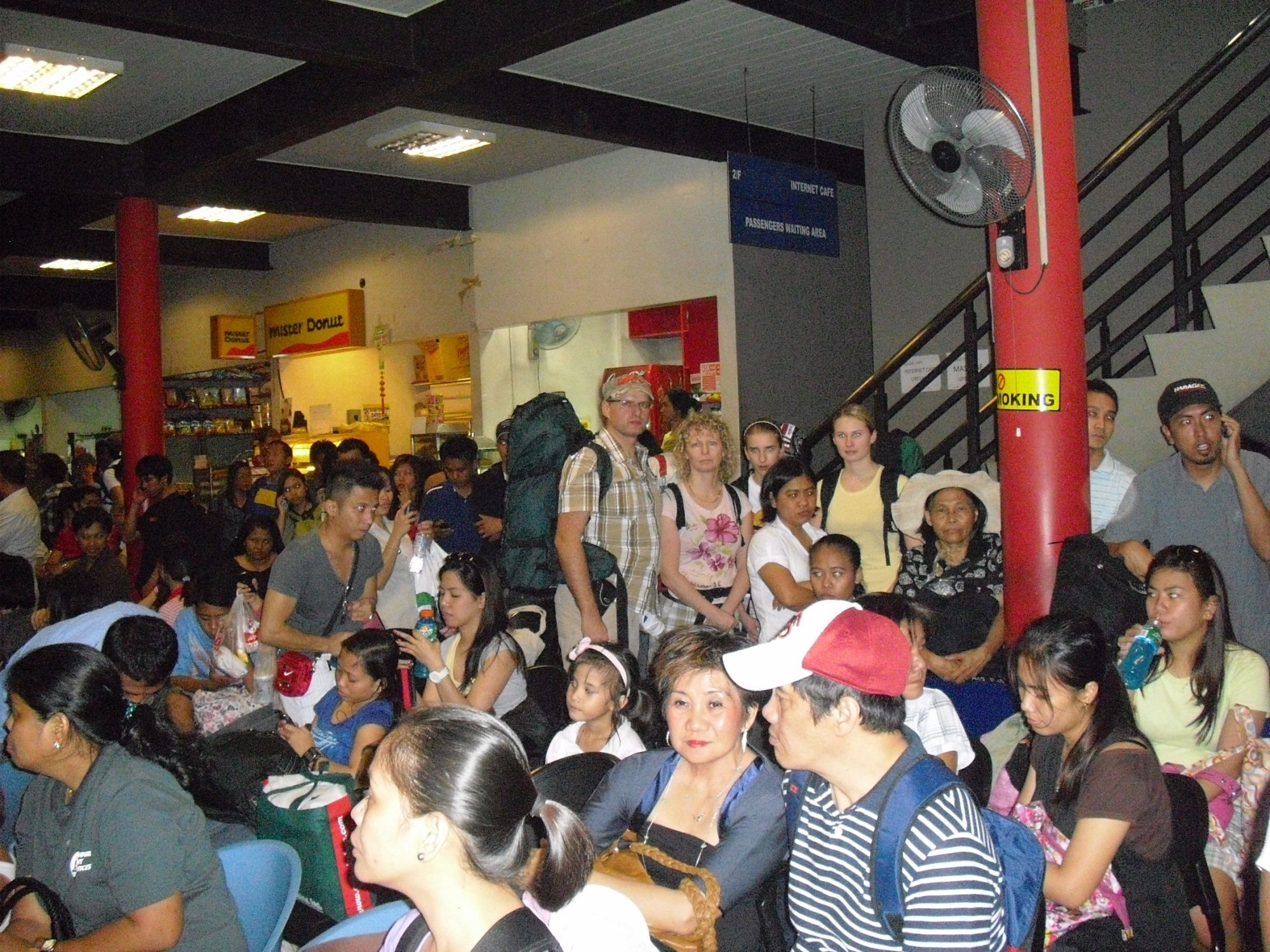 Let byl bezproblémový i když dost náročný – 7 a 7 hodin s mezipřistáním v Dubaji (3 hod). V Manile na letišti jsme si vyměnili pár dolarů za pesa a na toaletě jsme se převlékli do letního. Hodili bágly na záda a vyrazili. Bylo 18,45 hod místního času. Udeřilo na nás vlhké teplo a spousta taxikářů. Jedním jsme se nechali odvést na busnádraží Victoria. Je nutné dát si pozor na to aby zapnul taxametr. A nutné dohodnout se nejen na částce ale i na to jestli je v pesetách nebo v dolarech. V opačném případě je to dost drahé. Nebyl ani čas na koukání po městě. To jsme si chtěli nechat až na konec.