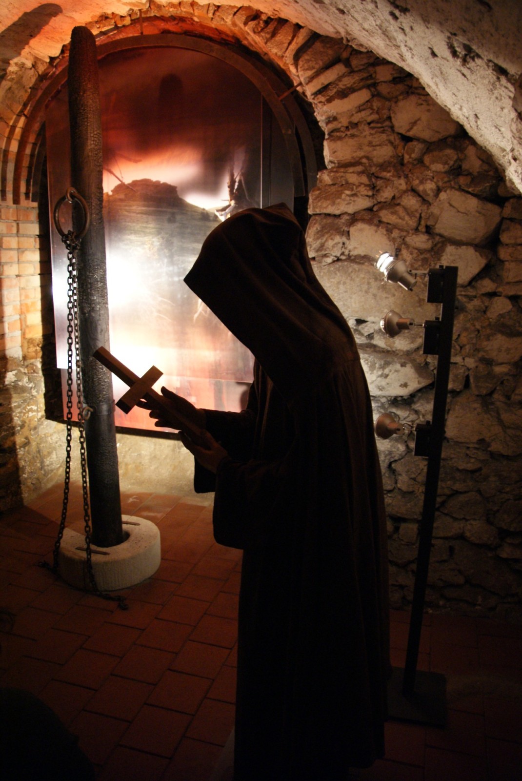 Po půl druhé dorazíme před Geschaderův dům, který je dnes objektem v pozdně barokní podobě. Krásná arkádová stavba bývá také nazývána Evropským domem setkávání a svého času zde žila jedna z nejstatečnějších obětí inkvizotora Bobliga, tedy bohatý barvíř a výrobce tripu (to je látka, ne něco veselého) Heinrich Pescke s ženou Marií. Otevřeno je od jedné, takže první vlna seniorů a poslední školní už by měly mít splněno. Celkem mi to vyšlo a většinu expozice si projdeme téměř sami. Šumperská expozice Čarodějnických procesů není sice hodnocena tak vysoko jako ta jesenická, ale rozhodně mi nepřijde o nic horší (a na rozdíl od Jeseníku se zde fotografovat může). Podzemím domu procházíme s audioprůvodcem, který nás expozicí provází hlasem inkvizitora Jindřicha Františka Bobliga z Edelstadtu. Jeho – místy až démonický – projev Vás nenechá chvíli vysadit, zvláště když jste opakovaně upozornění, že ty žluté svítící kříže v dlažbě, po kterých šlapete, představují jeho oběti. A je jich tu 25. Prohlédnete si také ukázky ze slavného filmu Kladivo na čarodějnice, který se natáčel – mimo jiné – na nedalekém zámku ve Velkých Losinách. Koneckonců v expozici nechybí ani legendární inkviziční kniha Malleus maleficarum (Kladivo na čarodějnice), tedy vlastně praktický návod, jak postupovat při soudech s čarodějnicemi. Jedna z nejděsivějších knih v dějinách lidstva by údajně neměla chybět v knihovničce žádného ženatého muže.