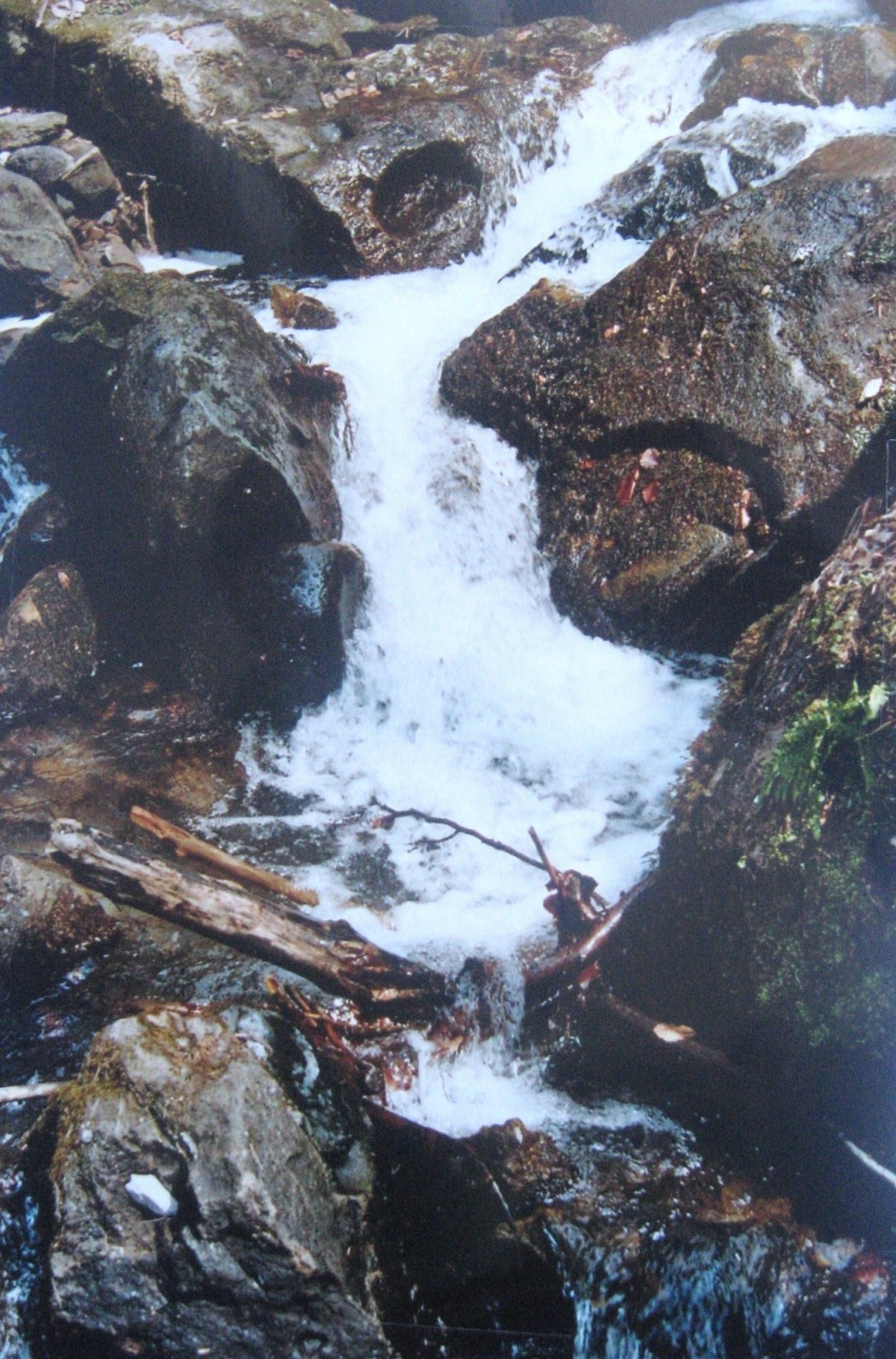 Ale já si budu stát za svým: lesní cestou přecházíme za 1. soutokem potoků pod srázný svah Bludného a zatím po rovině lesem k soutoku Bystřičky a potoka,odvodňujícího horu Čerňavu. Pak v lesním tichu slyšíme nezvyklý hukot tekoucí vody a to už jsme u cíle. V délce necelých 100 m tu pod nejstrměším svahem Bludného - je poset nevábnými a rozeklanými černými skalisky - vytváří říčka Bystřička soustavu kaskád a malých vodopádků, což je v těchto vrších jev naprosto unikátní a vyjímečný. Nejvyšší vodopád dosahuje výšky více jak 1 metr - ( měřeno při Jarním průtoku vodstva ) - a tak by měl splňovat základní kritérium pro vznešený titul "vodopád" ! Kolem kaskád vede proti jejich spádu do kopce lesní cesta, Jana jde nahoru po ní, my dva s Danem přes a těsně kol kataraktů. Celé místo má jen jedinou malou vadu na kráse - nad místem, kde kaskády končí, se nachází malá loučka a lesní cesta potok nepřekračuje mostkem, jak by se to slušelo, aby to bylo více estetické, ale skrze nevzhlednou betonovou rouru !! Ta loučka se nachází těsně vedle hlavní silnice - mohla by tu parkovat až 3 auta - a je proto s podivem, že o místu málokdo ví. Vtip je ale v tom, že z té velké zákruty lesem není potok vůbec vidět a z jedoucího vozu " řev Niagár" jaksi neuslyšíte...