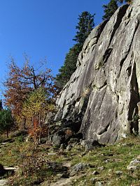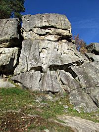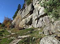 Pak už zbytkem hvozdu sestup k tunelu, nazpět k Motorestu po mostě a přechod přes velmi frekventovanou silnici. Stálo tam odpočivadlo využité mnou ke svačině a mezitím kolem mne nahoru k Čertovým skalám prošly dva starší páry seniorů. Zanedlouho jsem jim byl v patách a spolu s nimi zblízka obdivoval tu až neskutečnou a přízračnou skalní hradbu, táhnoucí se našikmo kopcem k jihozápadu. Pomalu jsem si úpatí stěn prošel až na její konec a přitom zavzpomínal na nejranější mládí.