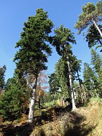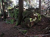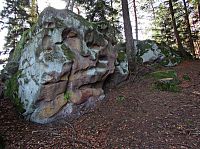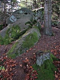 Po dostatečném poobdivování a nasycení se výhledy jsem se konečně odpoutal a zamířil do blízkého hvozdu. Tady se polní komunikace změnila na vrstevnicovou cestu lesní a o kus dál mne čekal šok v podobě z části nově vyrubaného hvozdu. V minulosti jím kryté seskupení a mně dobře známé seskupení několika skalek se mi nyní představilo v negližé, naštěstí blízká „Muzikální Příšera“ a nad ní ze stěny mrazového srubu výrazně vystupující „Čertův zub“ byly dosud stíněny korunami smrků. Možná to málokdo ví, ale také tyto Čertovým skalám protilehlé skalní výchozy a další podobné „kamení“ nejen v blízkém okolí, ale různě po Valašsku, jsou dílem satanáše. Ale ve skutečnosti byla prapříčinou všeho, jak už to tak na světě bývá – ženská!