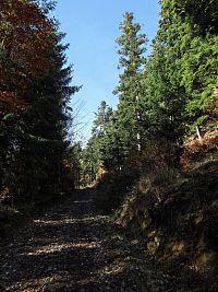Na rozcestí jsem si vybral komunikaci, klesající hvozdem do 2 km vzdálené osady Mužíkov, za níž je v údolí Senice u hlavní silnice umístěna stejnojmenná zastávka autobusu. Cesta byla místy bahnitá, což mne zdrželo a při pohledu na hodinky byl nucen kvůli zrychlení přesunu vyměnit chůzi za indiánský běh. To ale příliš nepomohlo a za osadou jsem zkusil ten poslední kilometr překonat normálním během. I tak mi to bylo prd platné, a když jsem dokusal na zastávku, zjištěno, že mi bus před rovnýma pěti minutama ujel! A že ten další jede skoro až za dvě hodiny...