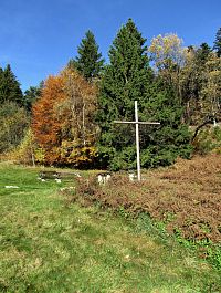 Cesta mírnějším stoupáním pokračovala k rozcestí, odkud stoupala strmým svahem boční komunikace na vrchol Kopců s pseudokrasovými jeskyněmi. Já ale pokračoval pod nejvýchodnějšími svahy Vizovických kopců stále dál vzhůru údolíčkem. Následoval hodně prudký výstup k hřebenu, přitom se mi při zpětném pohledu v hledáčku fotoaparátu objevila výseč Pulčínska. Pod hřebenem jsem protnul první louku a zarostlým chodníkem vyšplhal k té druhé větší, na níž se v létě konají tábory křesťanské mládeže. Zůstalo tu po nich posezení u dřevěného kříže a od laviček se otvírající krásný výhled na příhraniční kopcovitou valašskou krajinu. Aneb širokoúhlé panoráma od Hradiska a vesnice Pulčín s přilehlými javornickými vršky až po mohutnou hradbu Královeckého hřebene přináležícím Bílým Karpatům.