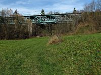 Po obhlídce „Čertova zubu“ a přilehlých skalek jsem se vrátil na křižovatku lesních cest a strmým odlesněným svahem po jedné z nich sestupoval k železniční trati a tunelovitému podchodu pod ní. Tady se mi díky převýšení nad kolejemi z prudce spadající paseky otevřel naprosto fantastický a mnou dosud neviděný pohled na protější hradbu Čertových skal! (Pravda, trochu tomu vadily dráty el.vedení, ale ty se přece dají doma při úpravě snímků ořezat, ne?)