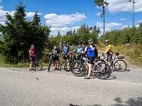Cyklotrasa 5128 stoupá po silnici 134 sice středně prudce, ale poměrně stále bez zmírnění k Nové Vsi, za kterou jsme nenápadně minuli odbočku ke zřícenině Janštejna (podle obrázků celkem zajímavá ruina). U Nové Vsi nás opouští část děvčat, která se touží vyráchat v nějakém koupališti. Ostatní vede mírný sjezd do Horních Dubének, kde jsme objevili zajímavý poutač na pivovar Kozlíček. Jde ovšem o malou garážovou provozovnu bez posezení. Pivovarník prodává ale různé tekutiny, které si můžeme zakoupit ve formě 1,5 l petflašek, tedy že ochutnáme cestou.