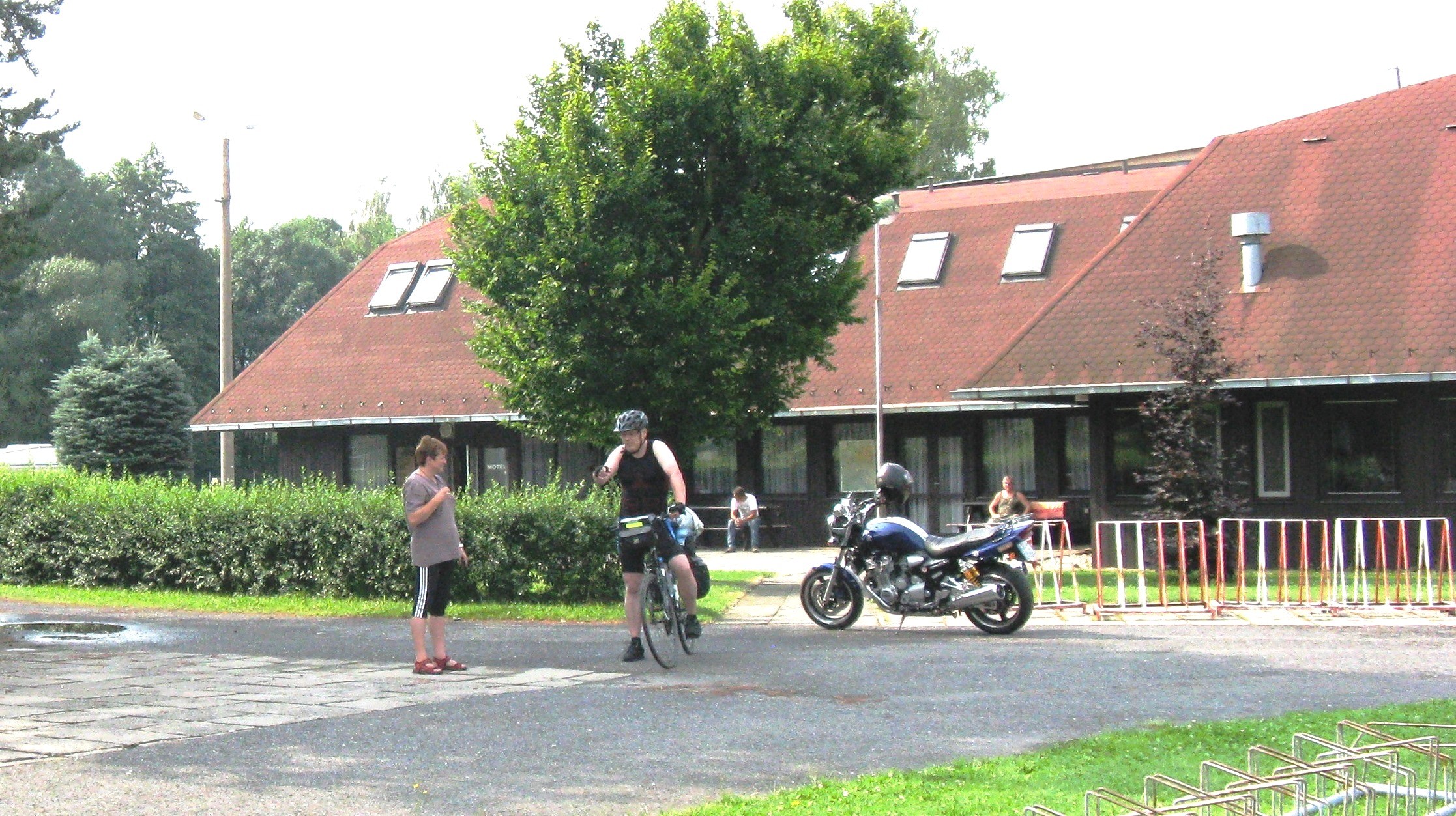 V pondělí jsme se rozjeli sehnat něco k snídani. Jirka navíc objevil za rohem vilku s cykloservisem a prodejnou, kde si opatřil plášť, který jej už první den opustil. V Raspenavě nebylo mnoho stravovacích možností, takže jsme se nakonec všichni sešli u stánku vedle fotbalového hřiště. Po jídle se nám udělala chuť na pivo, ale tu jsme si museli nechat zajít, neboť v pondělí měl asiat v kempu zavírací den. Chtěli jsme se vydat na cestu, ale vyskytl se nečekaný zádrhel. Mezi Zdeňkem a paní vedoucí kempu zaplápolal nesmělý plamínek sympatií (obr. 01) a Zdeněk se zasekl.