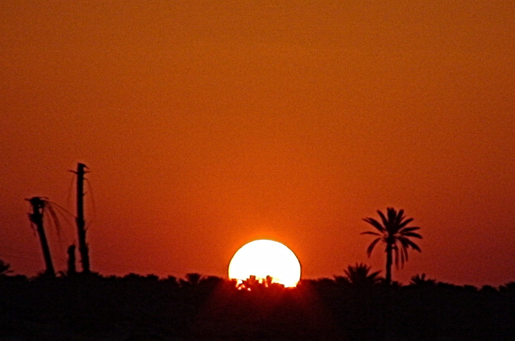 Druhý den cesty po Sahaře začínáme brzo ráno, abychom stihli východ slunce. Už jsem jich viděla hodně v různých krajích, ale opravdu to bylo tak, jak je to na fotografii a do lahviček si nabírám trochu saharského písku. Dnes jedeme do několika oáz přes solné jezero Chott el Jerid, které leží 23 m pod hl.m. Jeho rozloha je kolem 5000 km2 a vedou přes něho silnice, prý je vidět i fata morgána. Zastavujeme, procházíme se po jezeru, nabíráme si trochu soli a u stánku pro turisty si kupuji na památku hnědou solnou růži. Ty hnědé jsou přírodní, ale mnohdy jsou přibarveny do nepěkných barev. Pokračujeme kolem lagun naplněných solankou a zbarvených dle minerálů, které voda obsahuje.
