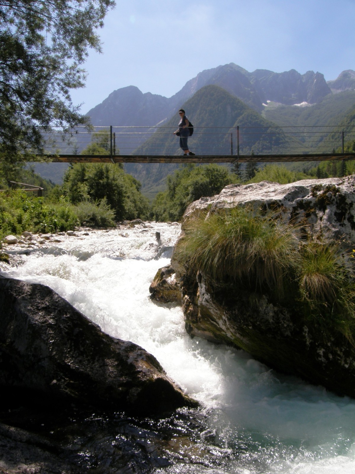 Kolegyně si trochu zvrtnula nohu a pobolívá to. Po dohodě se pomalu vracíme zpět. Při první příležitosti opouštíme turistickou pěšinku a vracíme se na silničku. Je již odpoledne, fouká poměrně dost vítr a tak je to horko snesitelnější. Cesta zpět se nám zdá nějak delší až si říkáme, že tak daleko jsme snad ani nemohli dojít. Ale je to tak. Došli. Jsme zpět u lávky přes SOču a za ní stoupá cesta do kempu. Jsme upocení a tak se ještě necháme zlákat osvěžením ve vodách řeky. Lezu do vody i v tričku, protože je stejně celé mokré. Tak teď už chápu, proč mají všichni vodáci neoprén. Voda má asi 8 až 10°C. To mi však nemůže zabránit v koupeli. Lehám si do proudu na břicho a potápím hlavu. No to je hrůza. Vyskakuji na nohy. Pookřávám. Ježíši, to je něco. Znovu se několikrát nořím pod hladinu. Ha. Připadám si jako znovuzrozený. Lákám kolegyni ke koupeli, ale odvažuje se zchladit si pouze pobolívající kotník.