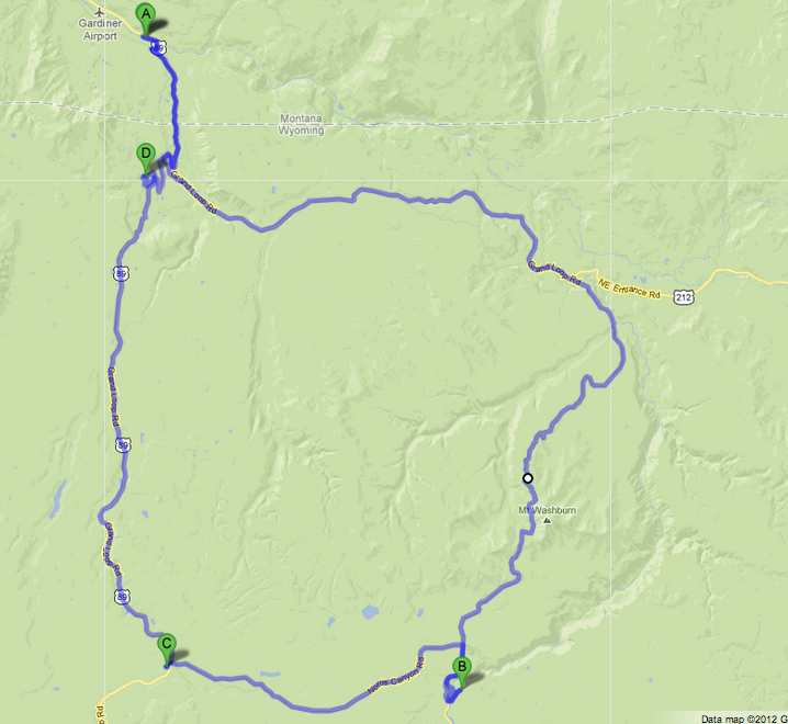 11. den 130 mil, B-Old Faithfull, C-Yellowstone Lake, D-Sulphur Caldron, E-Tower Fall autor: milousz