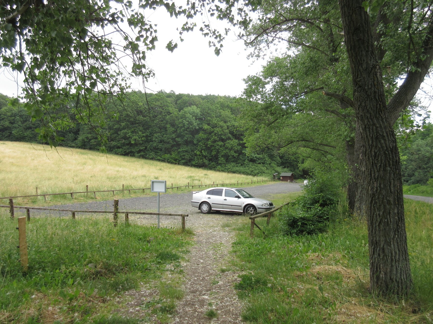 Milešovku. Ještě před obcí je obrovské parkoviště, které je asi v sezóně, možná i o víkendech zpoplatněné. Dnes tu stojí jedno auto a bouda je prázdná. To nám samozřejmě nevadí. Jen jsme mysleli, že se autem dostaneme o kus dál. Aspoň se při mírnějším stoupání trochu rozdejchám a snad se mi pak bude stoupat lépe. Je to docela prudké – na 2,5 km se má nastoupat 370 metrů.