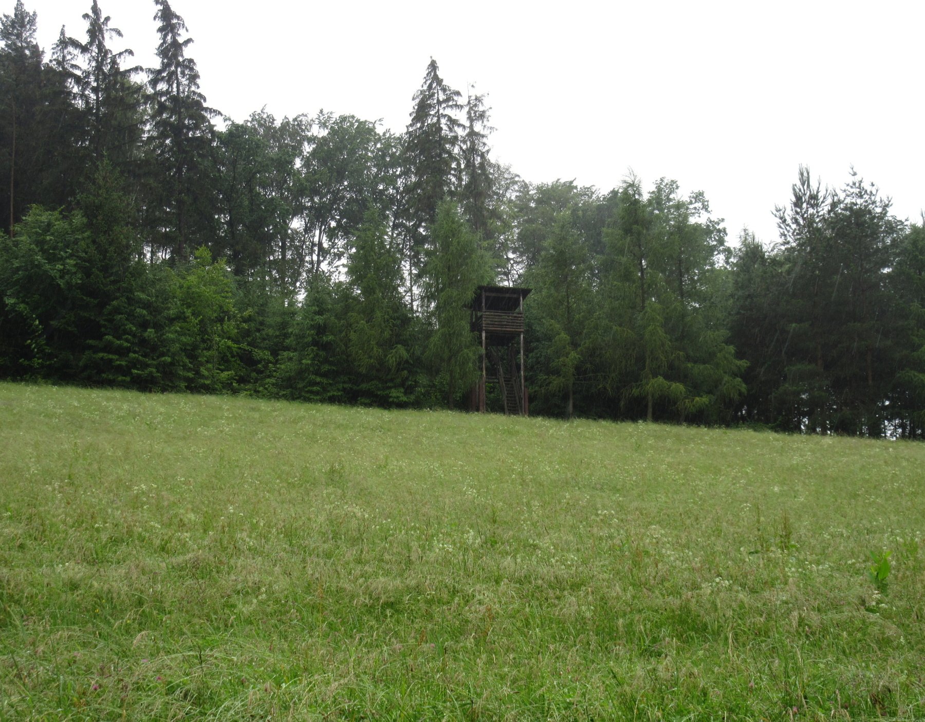 Kochnově, kde je rozhledna, zrušit nemůžeme. Pokus o to, vyjet co nejblíž, nevyšel. Auta tam jezdí, jsou tam domky, ale zaparkovat se nikde nedá. Ani se otočit. Takže couváme zpátky, parkujeme v obci a jdeme jinou, trochu možná kratší cestou pěšky. Abych mohla fotit, beru si deštník. Nahoru je to cca 0,5 km. Nejdřív vidíme zralé třešně, neodoláme a trháme je i za cenu, že budeme ještě mokřejší. Za chvíli rozhlednu vidíme, jenže k ní musíme oklikou. Přes mokrou vysokou trávu to nejde. Dostáváme se do míst, kam jsme skoro dojeli autem, a po cestičce vysekané v trávě jdeme k rozhledně, která byla otevřena r. 2014. Je to dvoupatrová dřevěná rozhledna s poměrně strmými, ale pevnými schody. Výhled je až překvapivý. Jen dnes je mlhavo. Nahoře jsou však desky s barevnými fotkami, kde jsou zajímavé orientační body popsány. Je vidět