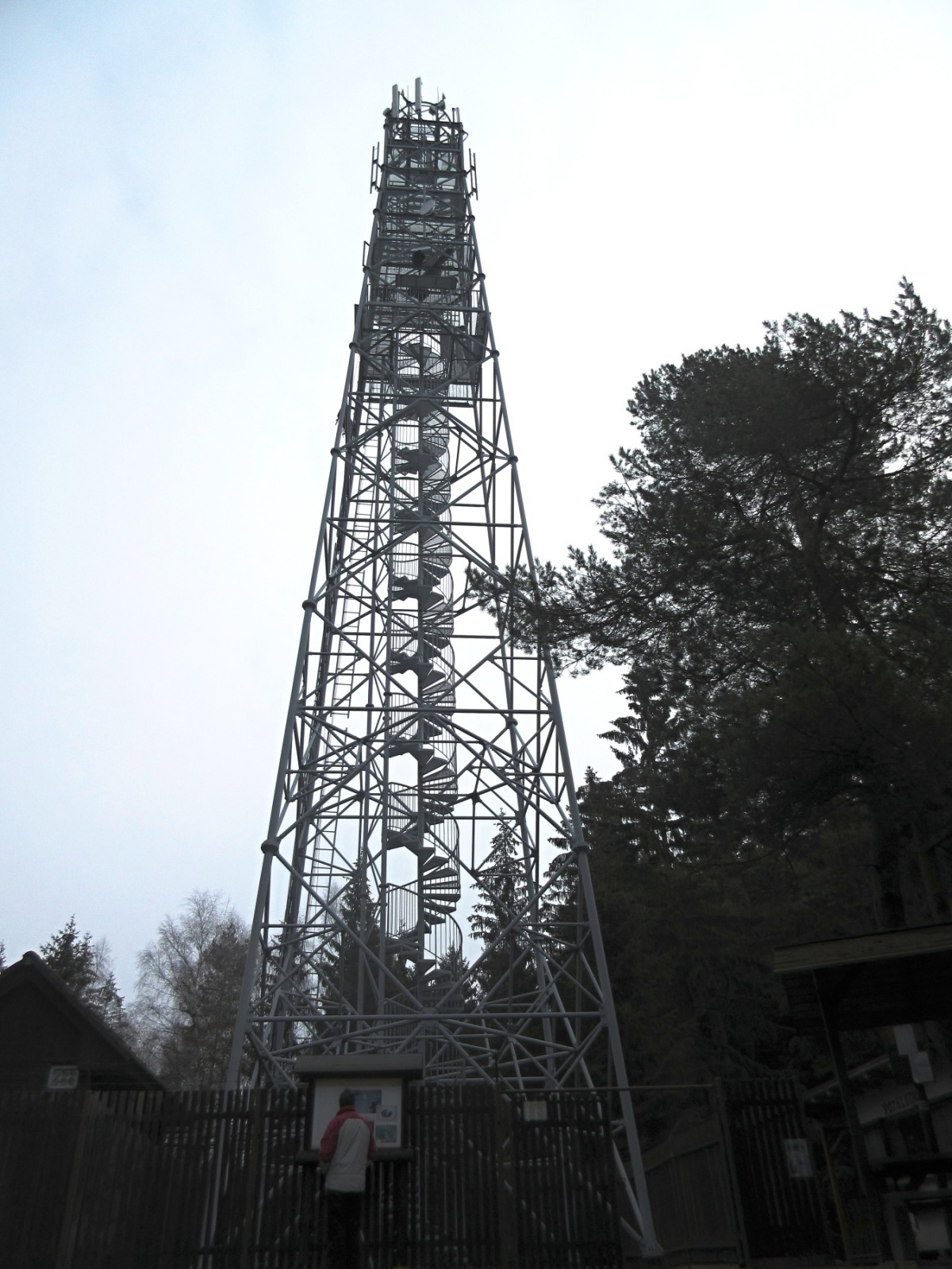 A teď už na rozhlednu Karasín. Zdálky jsme ji viděli. Skutečně je vysoká, okolo jsou sjezdovky, vleky, takže výhled nádherný a kruhový. Tedy byl by, kdyby bylo jasno. Ale i tak to bylo super. Dole je bufet, jsou tam i toalety. Rozhledna je volně přístupná, v době otevřeného bufetu se platí 10,- Kč, ale dostanete ke vstupence plánek výhledu s dalšími informacemi z okolí.