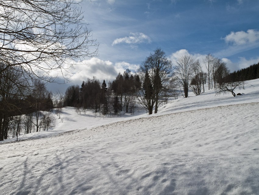 Pak už dojíždíme k odbočce přes vrchol Dzial, kde je vlastně již trasa Malého Šengenu, tady dnes už rolba dojela. Stopa je tedy dosti kvalitnější. Následuje kratší rovinka, velká zatáčka a malý sjezd do serpentiny v údolí potoka, který je vlastně počátkem Bialy Lądecké, která tvoří osu této části hor (nakonec na podzim jsme kousek kolem ní jeli na kole ze Stronie Sląskiego). Tady si ještě domažeme před výstupem k hranici u Travné hory. Ve dvě hodiny jsme zpět na naší straně. Teď ještě kterou stopu zvolíme dál, nejlépe vypadá ta k okruhu Pohádka. Ta se brzy připojí k zelené TZ a svahem Travné hory nás dovede k červené Promenádě, kterou bysme dorazili zase na Paprsek, ale obracíme se k Císařské boudě, stopa je dosti rychlá, tak do údolí Černého potoka, na Petříkov a do Ramzové. Akorát tak 20 minut k vlaku. Nakonec musím pochválit i účastnice výpravy, protože 26,5km na místy zmrzlé stopě není zas tak špatný výkon.