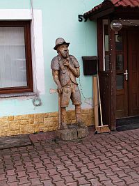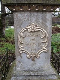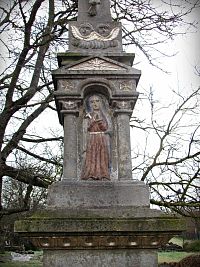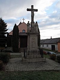 Na konci návsi protnuté hlavní silnicí jsem za parkovištěm narazil na velmi zajímavý kamenný krucifix- rozkošnou to ukázku naivního lidového sakrálního umění. Základní pískovcový sokl má podobu hranolu a na čelní straně směrem k silnici se na něm skví nápis POCHVÁLEN BUĎ JEŽÍŠ KRYSTUS 1869, lemovaný ze stran štukovou „rostlinnou“ ozdobou. Nad ním vystupuje již užší, zato velmi členitá střední část podstavce, kde v malé „kapličce“ se sloupy stojí polychromovaná Madona (či nějaká světice). Nad trojúhelníkovou střechou „kapličky“ vykukují dvě hlavy andělíčků a teprve nad nimi se tyčí vlastní menší kříž s ukřižovaným Ježíšem.