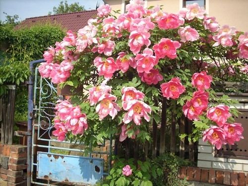 Jak jsme si to naplánovaly,tak jsme také provedly.Vyjely autobusem do Dobětic a odtud mezi domky prudkým strmým stoupáním razily k vyhlídce.Hned začátkem stoupání nám vzduch ovoněl nádherný vysoký keř s překrásnými květy za plotem,které voněly jako pivoňky. Nedalo nám to,abychom si nepřivoněly…to vám byla vůně,já když mě něco krásně voní,tak čichám a čichám a připadám si jak feťák….třeba takový šeřík,s ohromnými květy,který kvetl opodál,ten taky tak nádherně voněl….,no,pokochaly jsme se vůní a postupovaly dál. Stoupání to bylo děsné,škoda že jsem neudělala fotku.Ale po krátkých zastávkách jsme to zdolaly a stanuly jsme u rozhledny.