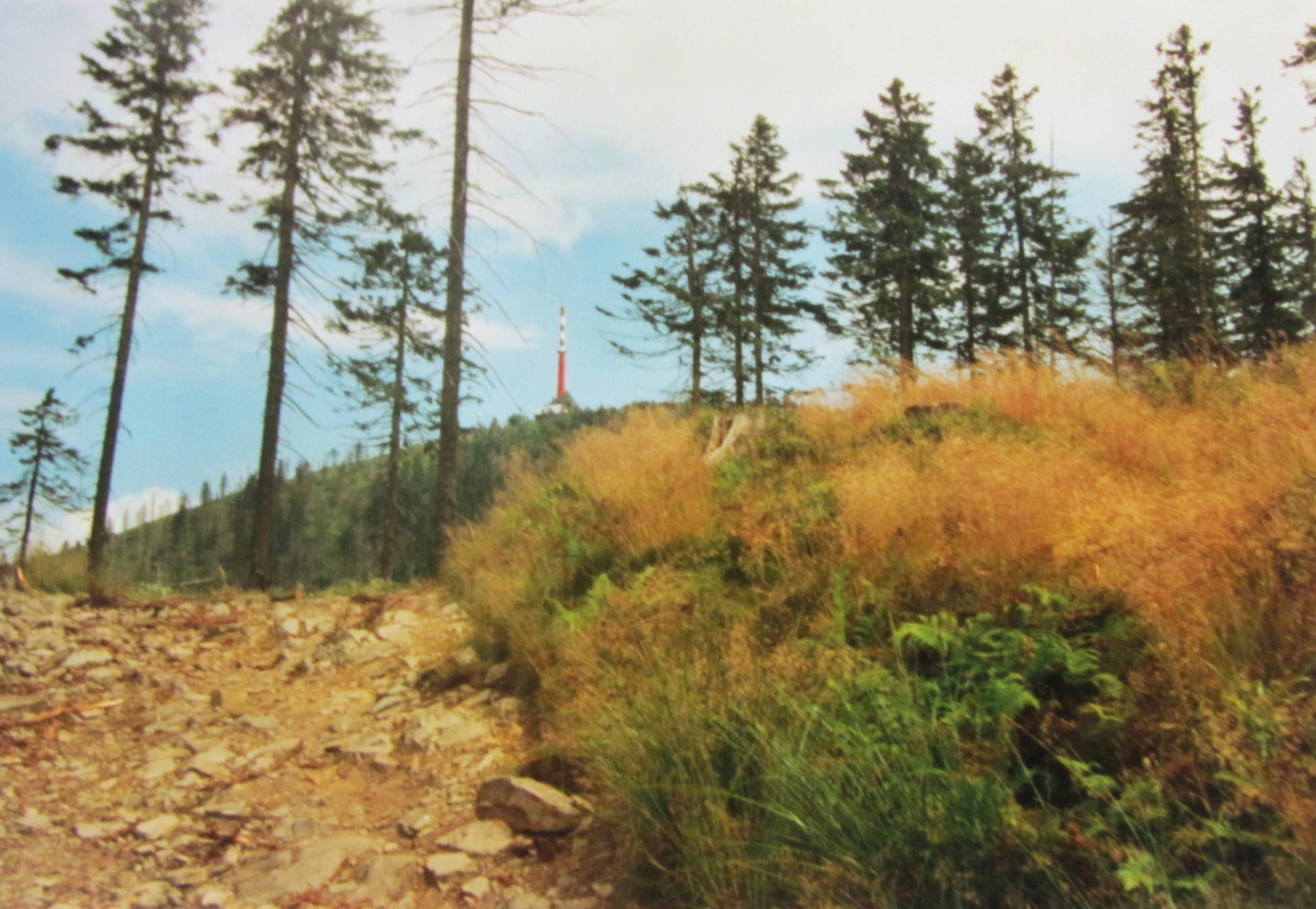 Další zatáčků sa dostáváme k dřevěném altánku s lavečkami, gde je aj rozcestník značených cest. Je tu aj jedna hysterická cérka, kerá má na nohách střevíce s vysokýma podpatkami ( !!!) a jačí na skupinku, ze kerů došla, že už dál nigde néjde a že ju tady majú nechat v klidu umřít !! Nemáme čas na to, abysme sa podívali, jak to dopadne - k vrcholu eště daleko - a tak funíme dál ... Obdivuju Míru - myslél sem si, že gdyž v práci na úřadě furt sedí na stoličce v kanceláři, tož že bude remcat a nebude ně stačit, ale opak je pravdů - nestíhám já ... Z jednéj zatáčky sa nám otevírá pohled na ohromnú propasť pod nami a vidíme Frýdlant a aj Frýdek s Místkem a krajinu široko daleko. Docházajů nás dva pánové středního věku s mladým ogarů a na chvilku nám půjčujú dalekohled. Je sice trochu opar, ale opravdu enom trochu a my máme veliké štěstí, že je dneskaj tak pěkně, protože gdyby bylo škaredě, tož by byla HORA v mrakoch a my by zme viděli kulové ... Okrajem horského lesa - ( je plný všelijak pokrúcených a skorem holých stromů ,ty tady chudáci mosíja znášat ohromné vichry a větřiska ) - a přes kosodřevinu sa dostáváme dalšíma dvuma serpentinama výš a výš. Sú tady pomníčky luďom - nekeří tu aj "zařvali" - a všecky spojuje to, že měli všeci rádi HORU. Míra mě prchá dopředu, já sa snažím foťákem Směnů cosi vyfotit a obdivuju kuželovitý vrchol s velikým červenobílým vysílačem - už je enom kúsek nade mňů.