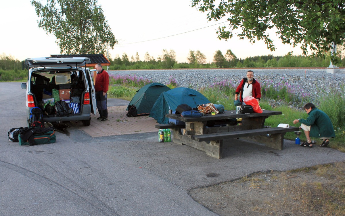 Když se po poledni druhého dne konečně vyloďujeme v přístavu Nynäshamn na švédském břehu, je před námi přejezd 1260 km do prvního tábora v Národním parku Rago. Podle navigace, kterou jsme pojmenovali Máňa, uháníme rychlostní silnicí E4 podél východního pobřeží Švédska směrem na Stockholm a Uppsalu. Je dohodnuto pokračovat v jízdě co nejdéle a před setměním najít vhodné místo na přespání. Setmění ovšem stále nepřichází a obloha je nadále taková nějaká konstantní– přijíždíme totiž do období polárního dne. Nakonec je za městečkem Gävle nalezeno u silnice výborné odpočívadlo s WC a umývárnou s teplou vodou, takže stavíme stany, vaříme večerní polévku a jde se na kutě. Někteří zapřisáhlí odmítači časného vstávání jsou polárním sluncem tak vykolejeni, že aniž to tuší, vstávají dobrovolně do bílého dne již před pátou hodinou ranní. Uháníme dál Švédskem několik set kilometrů, než se náš směr stočí u města Umea vlevo na E12 do vnitrozemí, směr Mo i Rana k norské hranici. Tankování na kreditní kartu u švédské samoobslužné pumpy se stává naší druhou maturitou; stále se něco učíme a přesto je to pokaždé jinak. Jednou vypne pumpa přesun PHM do nádrže dřív, než je tato plná a nikdo neví proč, podruhé zas nevydá terminál žádný doklad o zaplacení tankování.