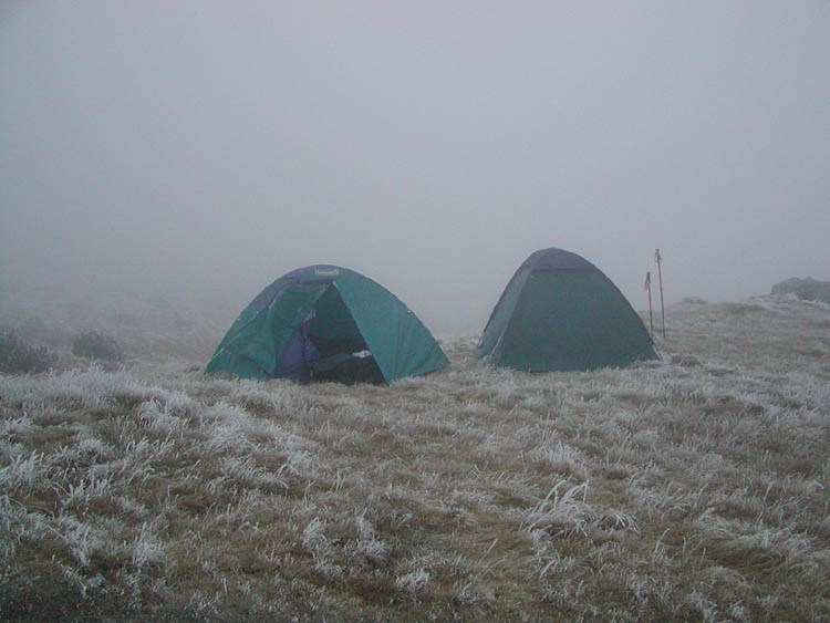 Na určené místo do Pyšného sedla jsme dorazili něco málo po desáté. Viditelnost něco málo kolem 10 metrů, teplota mírně pod nulou a stále klesá. Takto nás přivítalo Pyšné sedlo. Bleskově stavíme stany a po mírné večeři raději rychle usínáme.