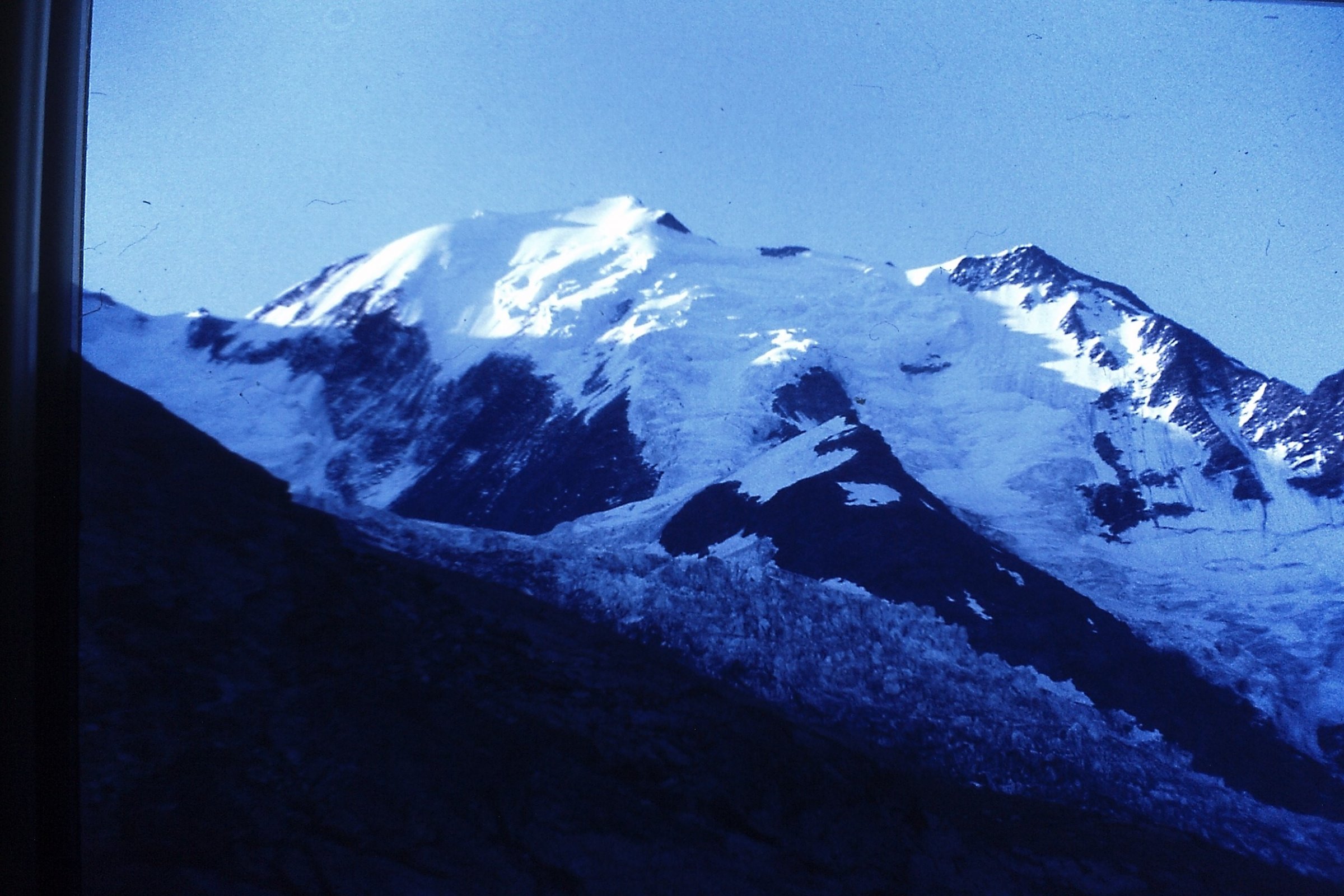 Další den přejíždíme autobusem do překrásného Valle ď Aosta, údolí plného starých hradů, měst a středomořského rostlinstva a po poledni se noříme do tunelu pod Mont Blancem. Chamonix, město prvních dobyvatelů nejvyšší hory Evropy, je alpským střediskem se vším, co k němu patří. Táboříme u blízkého jezera a sbíráme síly na zítřejší výstup. Ráno odjíždíme naším autobusem do St. Gervais La Fayet, nastupujeme na zubačku s poetickým názvem „Tramway du Mont Blanc“ a za hodinu a půl jsme vyvrženi u čela ledovce hluboko pod horou u chaty Nid ď Aigle. Čeká nás těžký čtyřhodinový výstup, zprvu po suti, pak po sněhu, překonáváme kamenopád – kdo má přilbu, ten ji nasazuje a začíná velký stoupák, v závěru s fixními lany ve skále. Obtížně se dýchá, ale cesta dolů už nevede. Ve tři odpoledne jsme všichni – zdatní horští vlci důchodového věku, protřelé turistické rodiny s velkými dětmi, samotáři – dobrodruzi i obyčejní adepti některé z turistických kanceláří, nahoře na chatě Aig. de Gouter (3817 m.n.m), tedy tisíc metrů pod vrcholem nejvyššího bodu kontinentu, kde je hlavní noclehárna pro noční výpravy na Mont Blanc.
