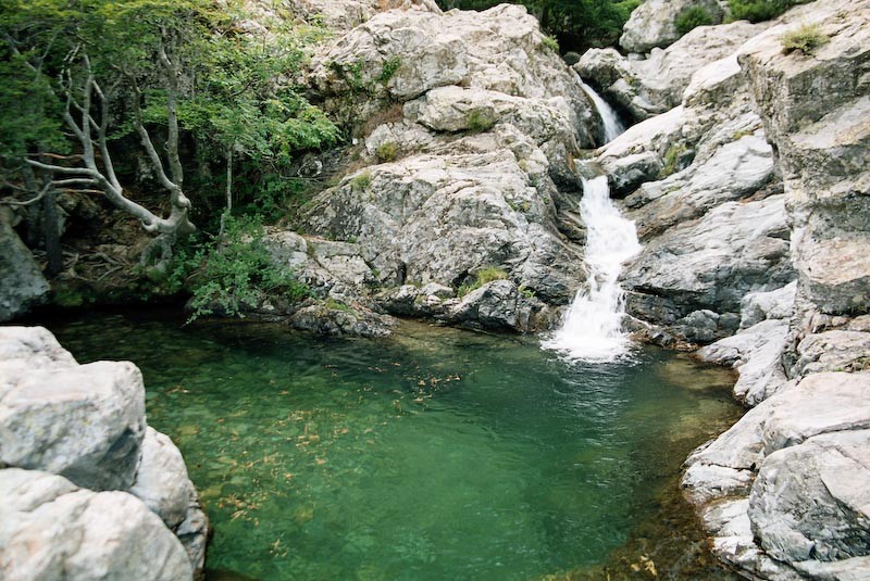 Po návratu dobrovolníků z osmisetmetrového výstupu na vrchol Monte Rotundo (2622 m), na který vyrazili před svítáním s naším horským vůdcem, čeká výpravu poměrně prudký sestup do údolí. Z oněch devíti set výškových metrů, které musíme sestoupit k nejnižšímu bodu trasy, mostu přes potok Manganello pod salaší de Tolla, začínáme ukrajovat hned od chaty po hlavní vysokohorské cestě GR 20. Sestup kamenitou stezkou prudkým holým údolím dává docela zabrat hlavně kloubům a pálící slunce na hlavou zas nutí k častému doplňování tekutin. Naštěstí míjí stezka několik potůčků či menších vodopádů, v nichž můžeme smáčet hlavy; hnacím motorem je pak vidina kaskád Manganello, u nichž má být podle itineráře přestávka s koupáním. Srdce romantika a milovníka přírody zaplesá při spatření této nádherné soustavy kaskád, které tu potok padající přes široké skalní prahy vytváří. Nesčetné tůně s tyrkysovou vodou lákají k osvěžující koupeli, čemuž většina výpravy neodolá. Nemůžu se rozhodnout, zda se dřív koupat, či pobíhat kolem té nádhery s foťákem a kamerou. Další kratší přestávku, pro změnu degustační, si dáváme po necelém kilometru lesem u útulné salaše Bergeries de Tolla, kde čilý stařík vyrábí sýry, které doplňují výtečný zeleninový salát s rajčaty a olivami (7 €). Posilněni vyrážíme dál, neboť máme ještě před sebou asi 3,5 km výstupu k chatě, ležící o 500 výškových metrů nad údolím. U mostu přes říčku Manganello, se cesta GR 20 stáčí vpravo do svahu a pokračuje lesem proti toku potoka Grottaccia, kde se musíme náhle repelenty bránit útočícím hejnům komárů. Pozdě odpoledne docházíme k chatě Refuge de l´Onda (1431 m), kde na oploceném tábořišti nastává opět stejný rituál stavění příbytků a vaření kulinářských specialit. Oplocení zde chrání tábořiště před korsickými prasaty, která se kolem potulují. Dnes se mi nechce vařit, a tak využívám nabídky místní provenience a degustuji talíř obložený různými druhy uzenin, vyrobených z některého z příbuzných zde pobíhajících sanglier.