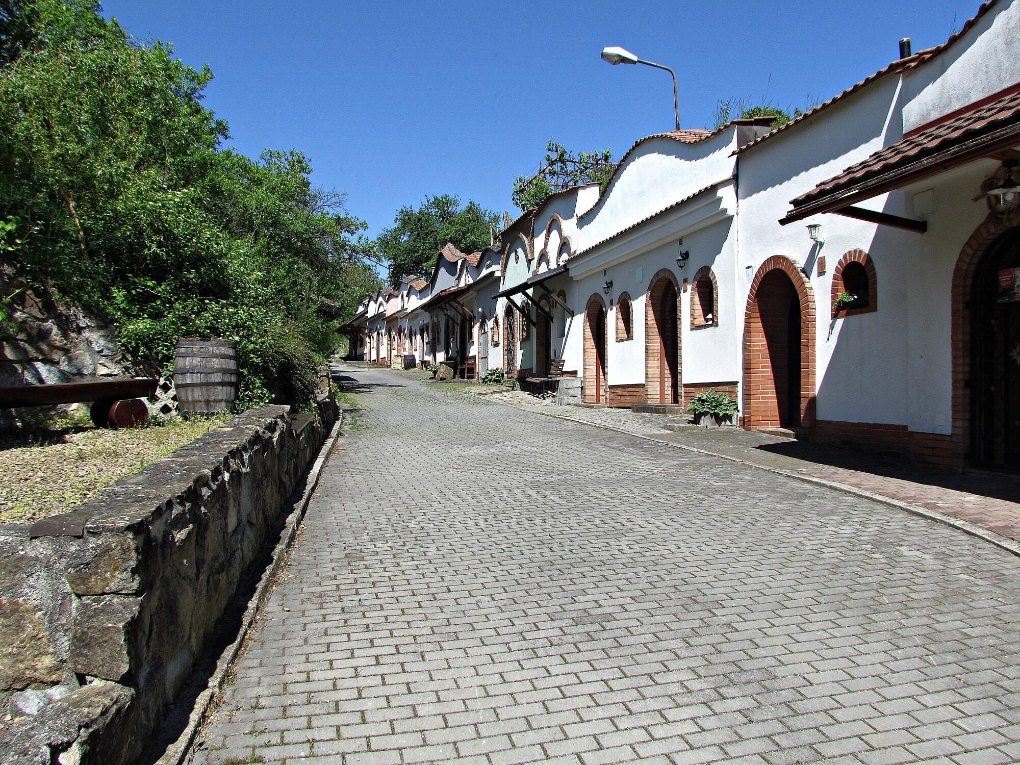 Od skvostné stavbičky jsem vykročil vlevo dlážděnou komunikací a po chvilce stanul na rozcestí obklopeném malebnou zástavbou. Odtud už jsem k hlavnímu dnešnímu cíli - Vinařské uličce vzdálené asi čtvrt kilometru, stoupal do svahu už mnohem užší (rovněž dlážděnou) ulicí. Cestou jsem míjel půvabná vesnická stavení s pitoreskními komíny a hospodářskými přístavky, nechyběly ani kouzelně rozkvetlé zahrady a stromy solitéry zpříjemňující výstup do kopce. Nad posledním domem, už na dohled Vinařské uličky, se cesta změnila na vydlážděný chodník, ale i ten byl po celé své délce osazen sloupy veřejného osvětlení.