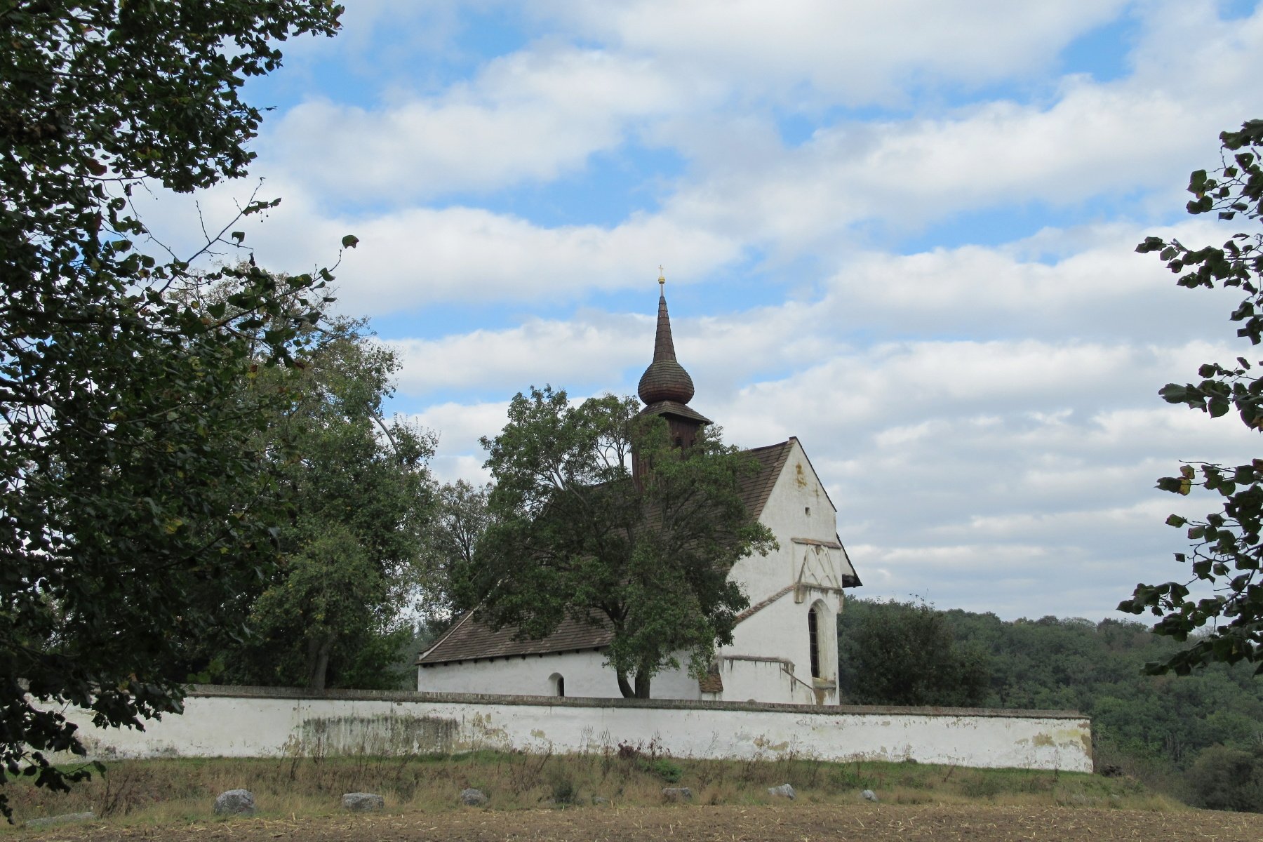 Kostelík je skutečně hezký, jenže je pečlivě ukryt za poměrně vysokou ohradní zdí bývalého hřbitova. Branka je zamčená, takže blíž se nepodíváme. Nejlépe byl vidět ze silnice, když jsme sem z hradu přijížděli. Okolo ohradní zdi je vyšlapaná cestička. Připadám si jako paparazzi, obcházím hradbu a hledám místečko, kde bych mohla něco víc vidět. Na jednom místě je u hradby vyšší kámen, ale stejně z něj toho moc nevidím. Je to škoda.