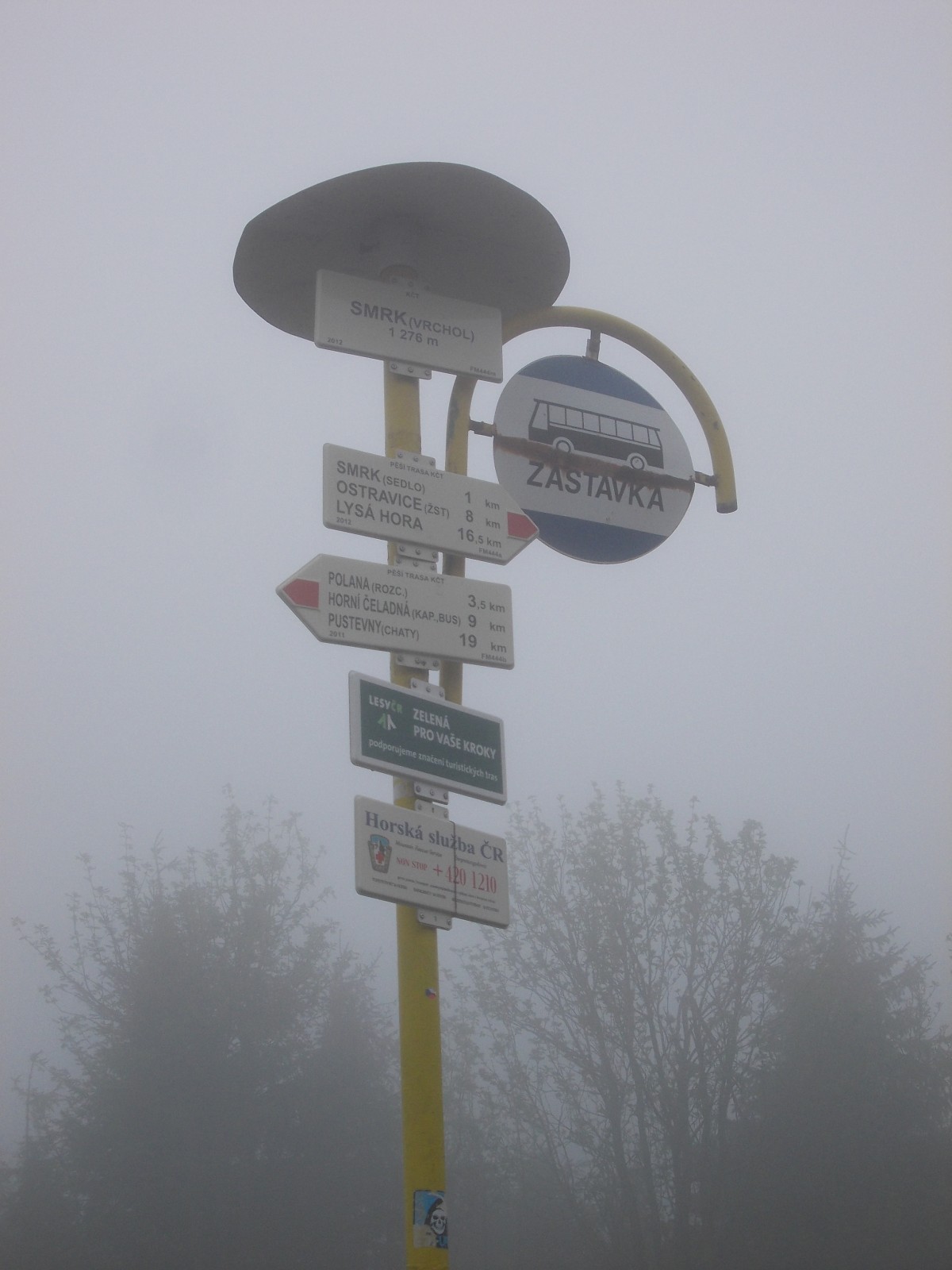 Asi po 2 km míjím bývalou školu, kde je nyní umístěn památník místního básníka Josefa Kaluse po dalších 2 km přicházím ke konečné autobusu a také k rozcestí v Horní Čeladné u kaple. Zajímá mě červená značka, která mě dovede až na vrchol Smrku. Nejprve doleva přes potok a společně s modrou až na Horní Čeladnou rozcestí, tady se ještě méně zdatní turisté mohou rozmyslet jestli pokračovat dál do vrchů a nebo jen traverzovat úbočí Smrčku spolu s modrou značkou a dojít také do Ostravice. Já věrný červené, lomím ostře Doprava a začínám stoupání.
