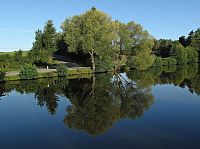 Od výklenkové kaple návrat na silnici a okolo rodinných domů s pěknými předzahrádkami na západní konec obce. Z „Bufetu u Filáka“, což je místní řezník, to krásně voní až ven k silnici... ale případné občerstvení (ba i tu kávu) vzdávám, neboť je teď po ránu venku dobré fotografické „světlo“ a než zmizí, hodlám jej do posledního zbytku využít. Za zatáčkou už totiž silnička prochází mezi dvěma ze tří umělých vodních ploch. Ačkoliv kouzelná jezera leží hned za Horní Lidčí a od Lačnova jsou vzdálena 2 km, přesto nesou název Lačnovské rybníky. Jejich celková rozloha činí 14 ha.