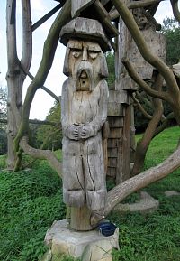 Konečně opouštíme Vsetín. Jedeme na sever - k další rozhledně. Z hlavní silnice odbočujeme do Oznice. Na jižním okraji obce parkujeme. Za posledním domkem je vysekaná tráva, nám se to jevilo jako parkoviště. Podle vyjetých kolejí asi někdo jel až k rozhledně. Těch 200 m do mírné kopečka pěšky však zvládneme. Když jsme se k ní blížili, prohlásila jsem, že mi to připomíná obydlí čarodějnic. Rozhledna Oznička je postavena na betonových patkách ze silnějších stromů, jsou ponechány i větve, které slouží jako opora, ale také jako zábradlí schodiště. Jen to bylo zbaveno kůry, snad možná i natřeno. Jen podlaha, zábradlí a střecha jsou z nařezaných ohoblovaných prken. U jednoho sloupu - stromu je dřevěná socha. Tak tomu říkám rozhledna s nápadem. Nic takového nemůže být snad nikde jinde.