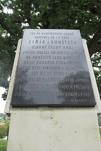Pomalu se vracíme. Ještě se jdeme podívat na zatravněnou bývalou baštu z 50. let 15. století, kde je kamenný pomník, který připomíná, že zde na hradě se r. 1420 narodil Jiřík z Kunštátu, pozdější slavný český král. Jeho otec Viktorin z Kunštátu zde žil od r. 1417. R. 1427 se Jiřík přestěhoval na své sídlo do Poděbrad. I odtud je výhled na zahradu Habrůvku a celý Kunštát, ale také ještě na Panskou zahradu v Podzámčí.